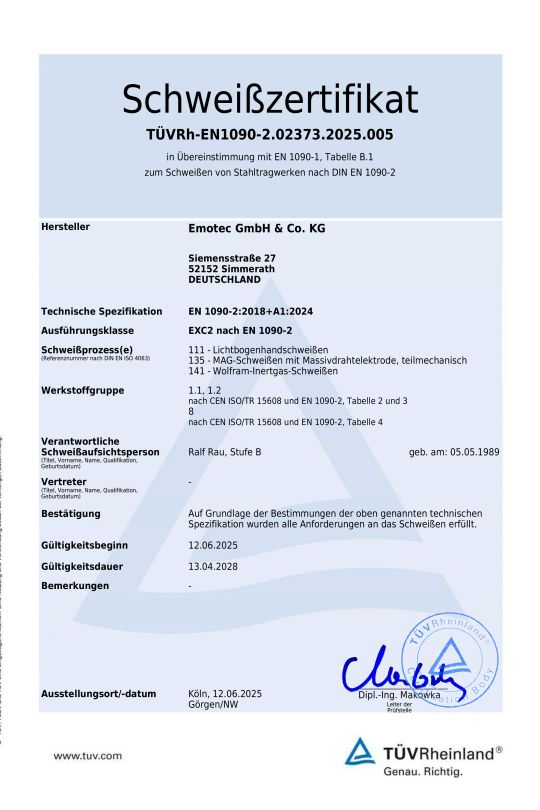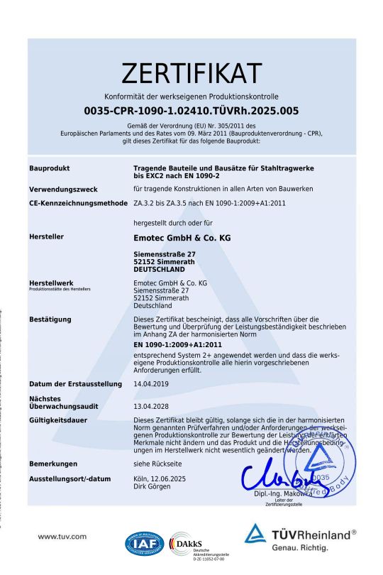 Nach DIN EN 1090-2 ist emotec zertifizierter Hersteller von tragenden Bauteilen und Bausätzen für Stahltragwerke bis zur Ausführungsklasse EXC2
